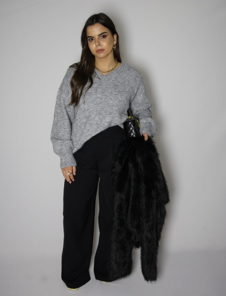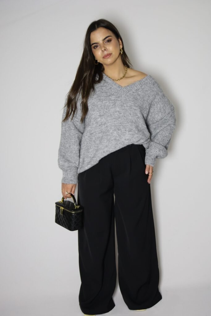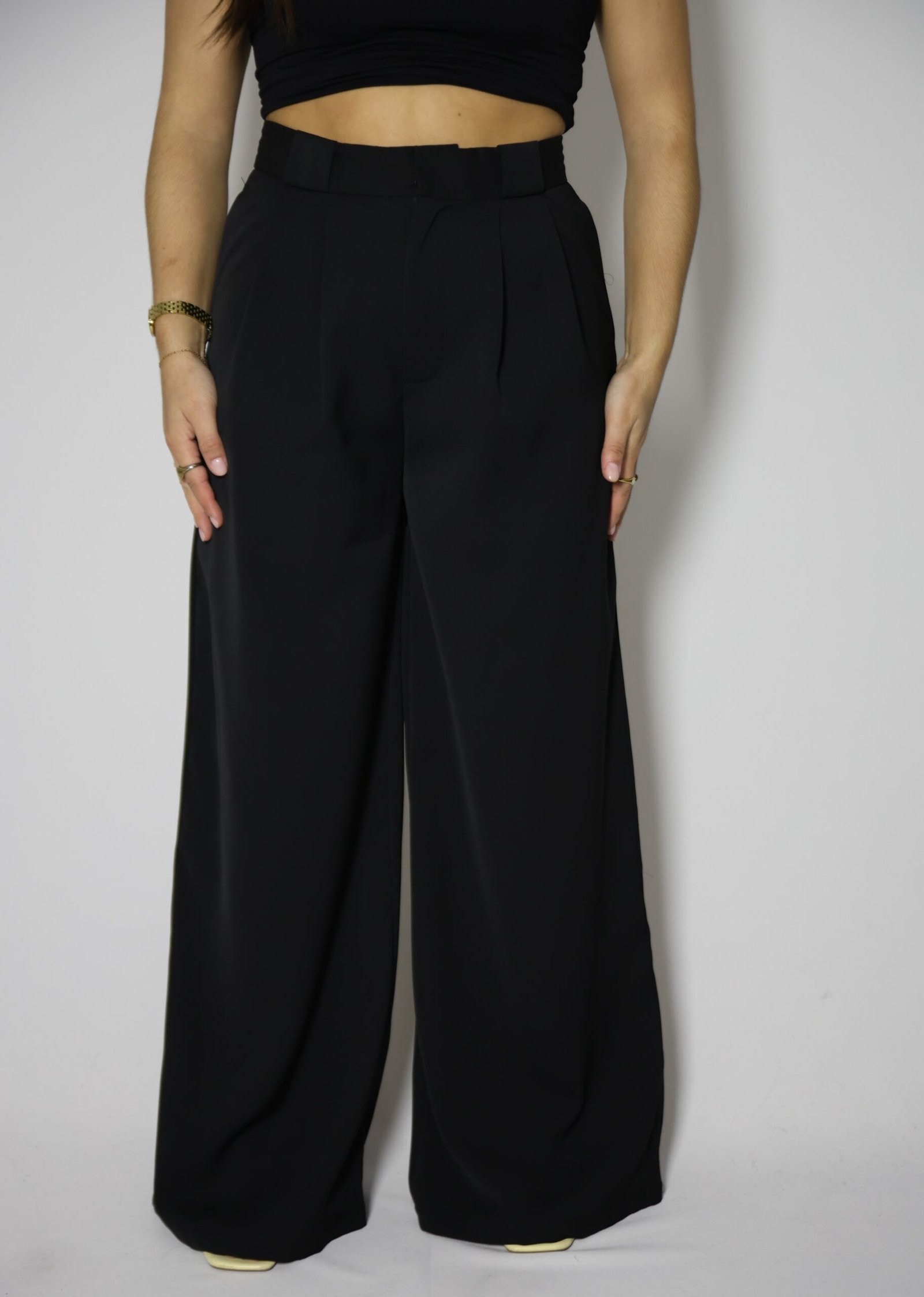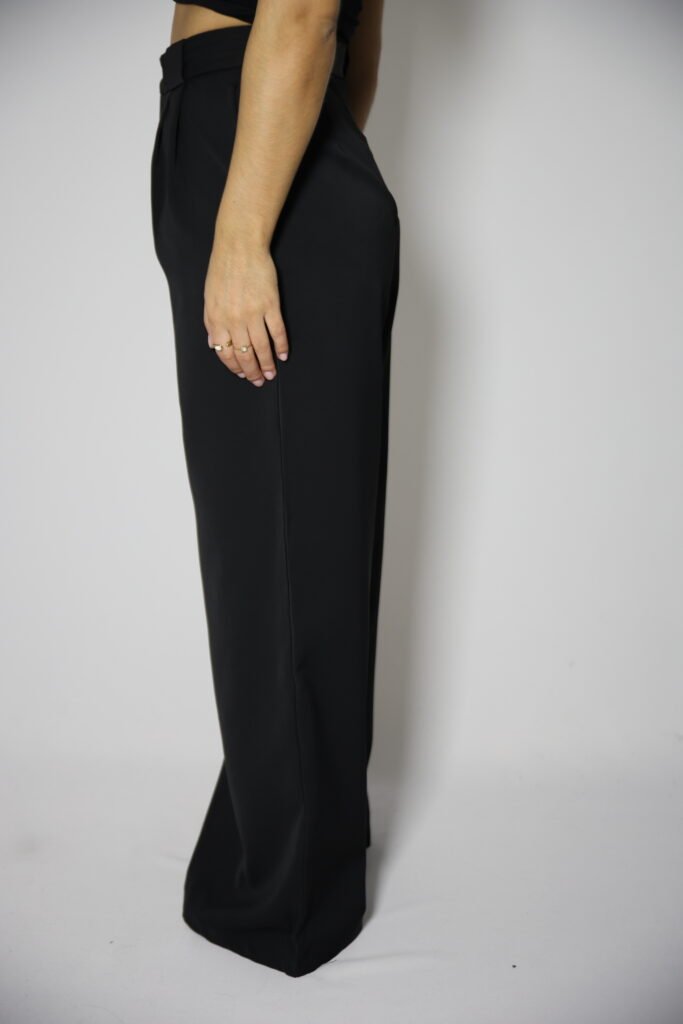 Calças de cintura média. Pinças à frente. Fecho frontal com fecho de correr, e gancho metálico.