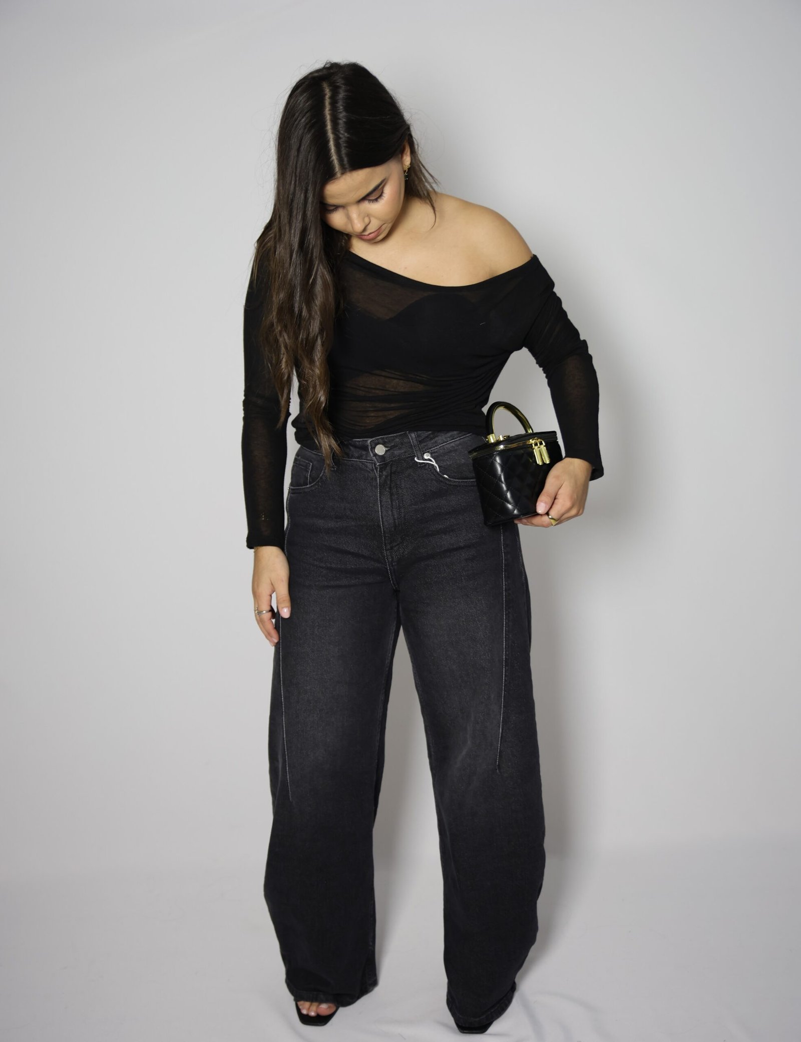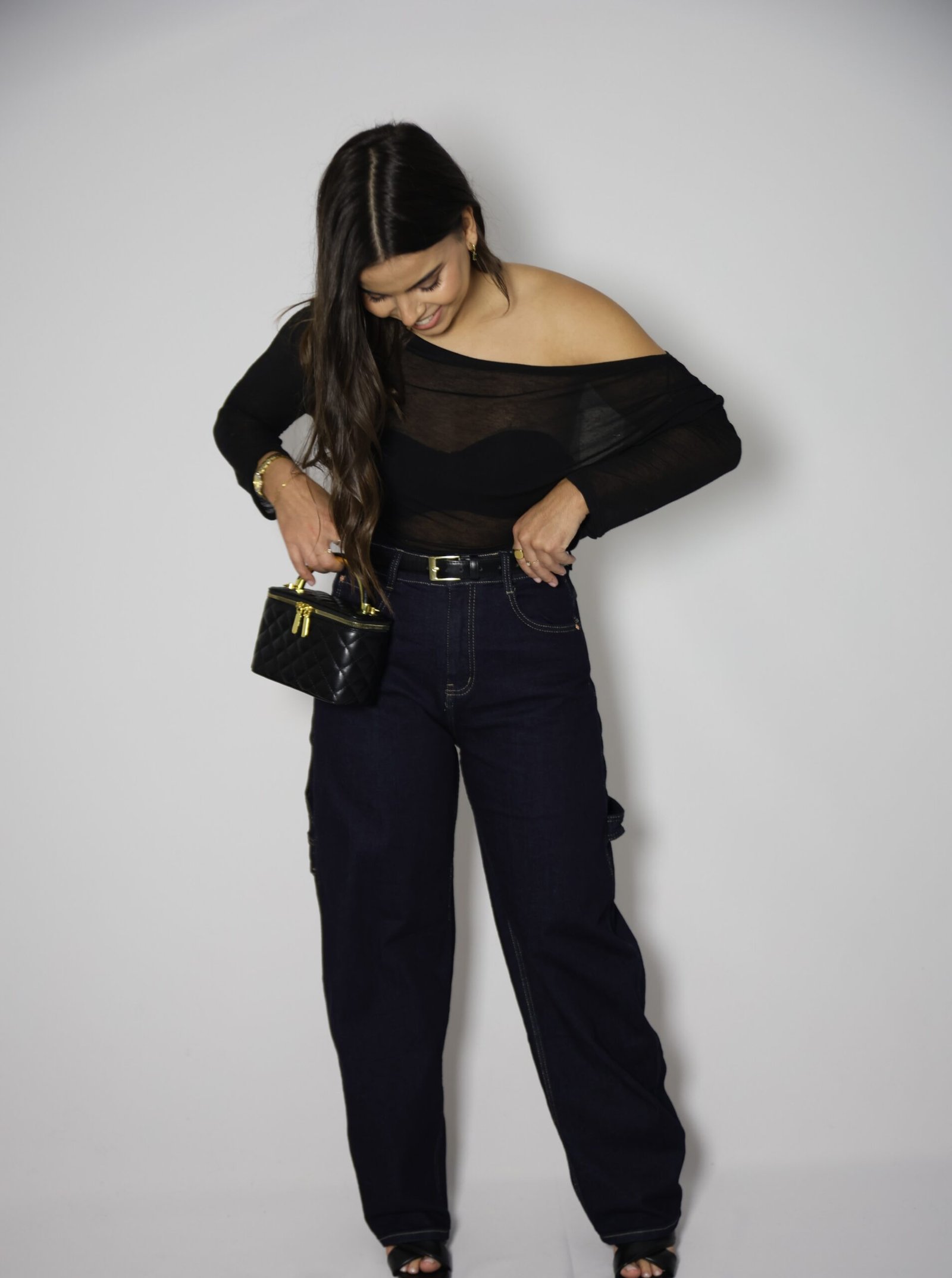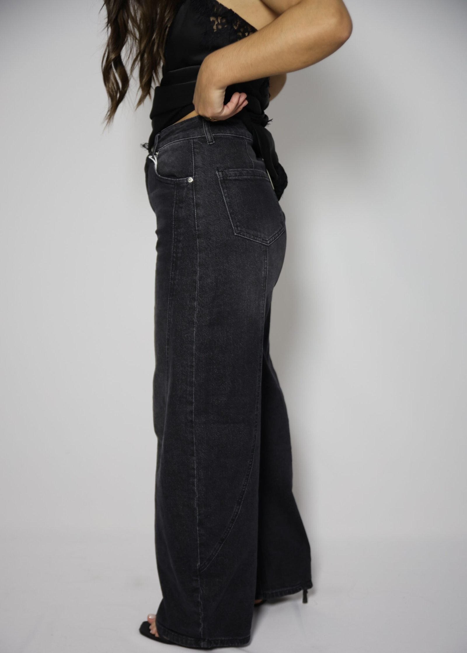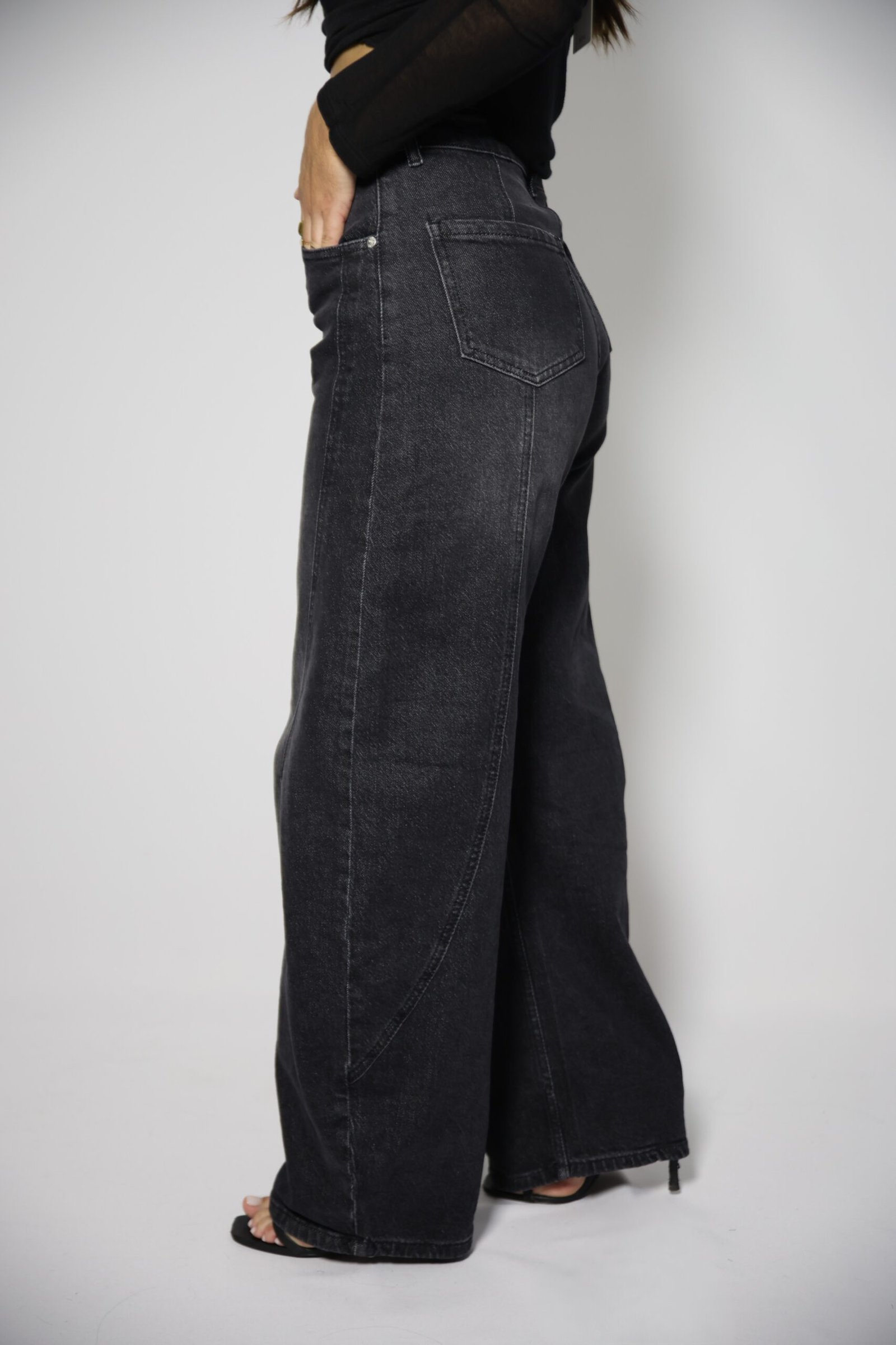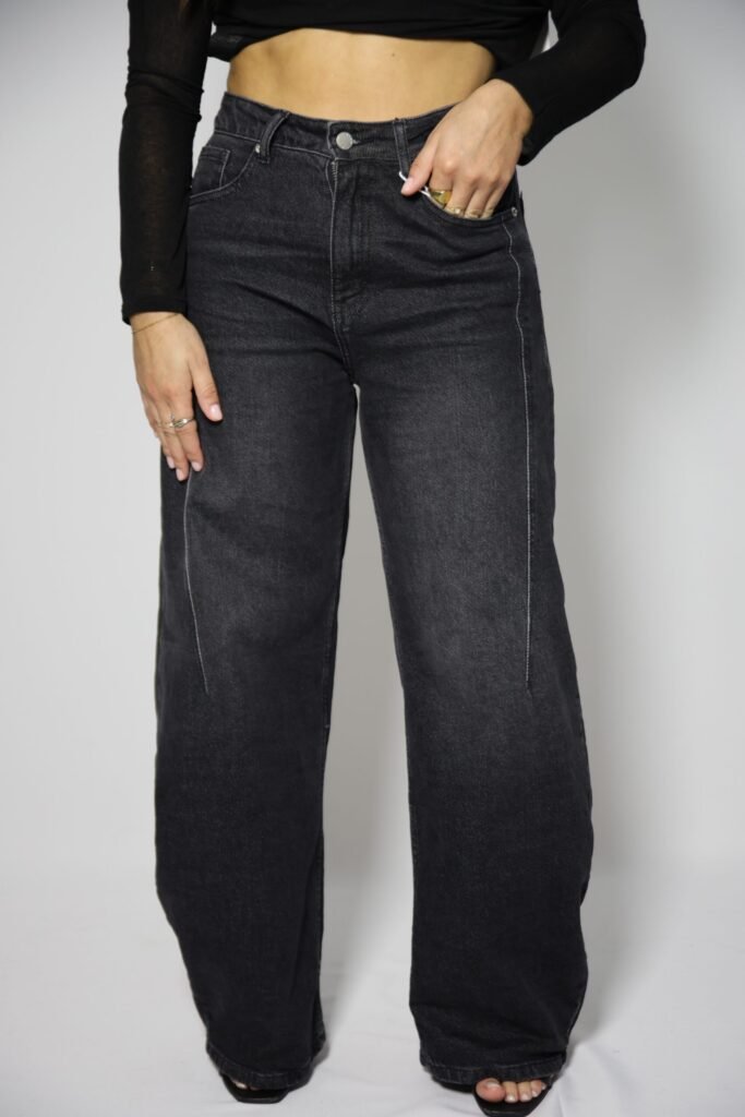Jeans de cintura alta com presilhas, efeito ballon. Bolsos à frente e atrás. Fecho frontal com fecho de correr e botão.