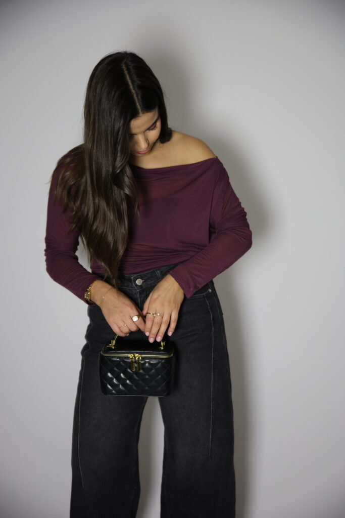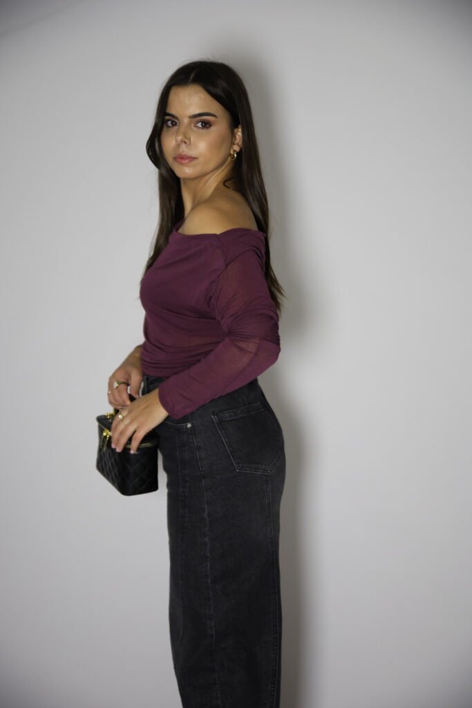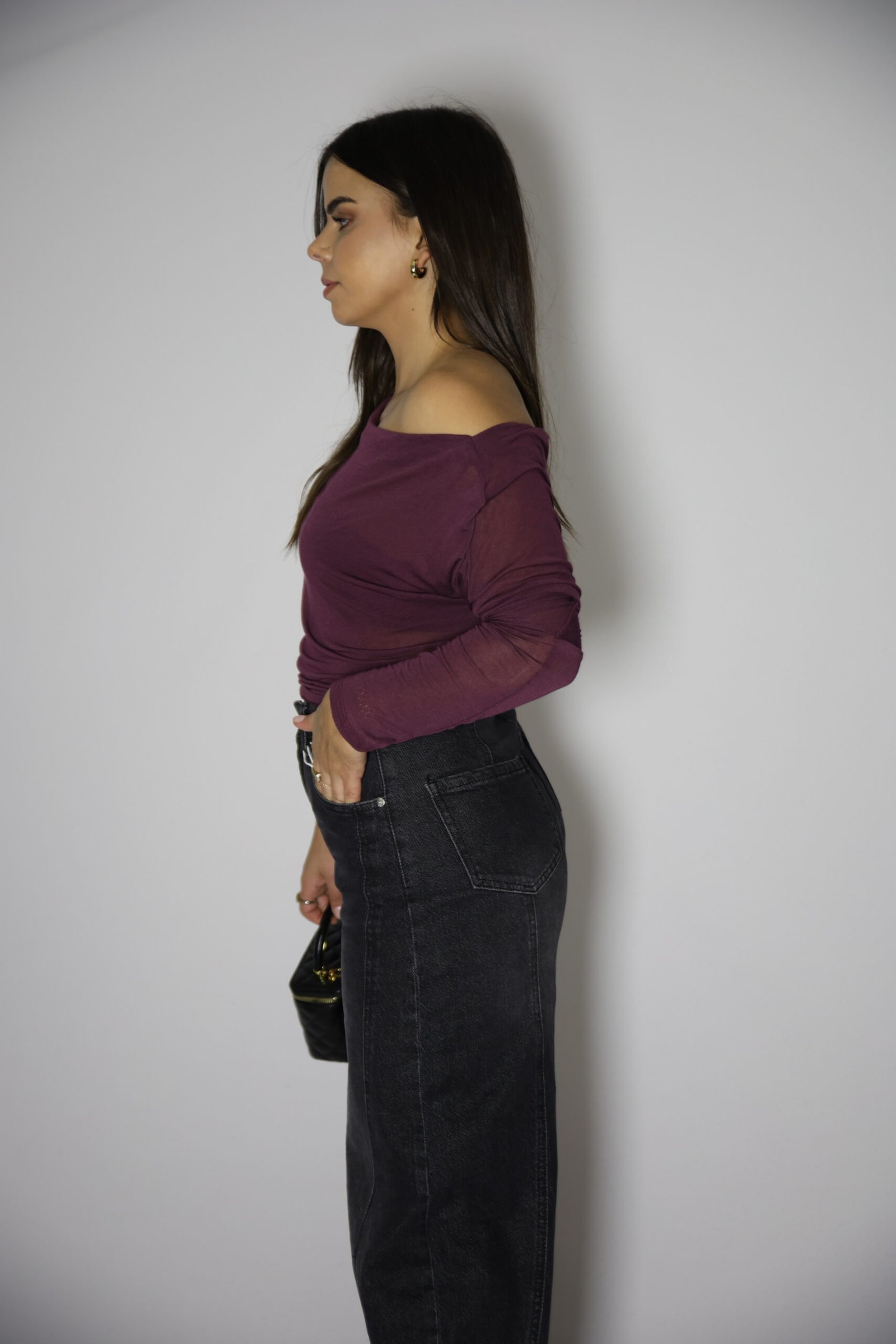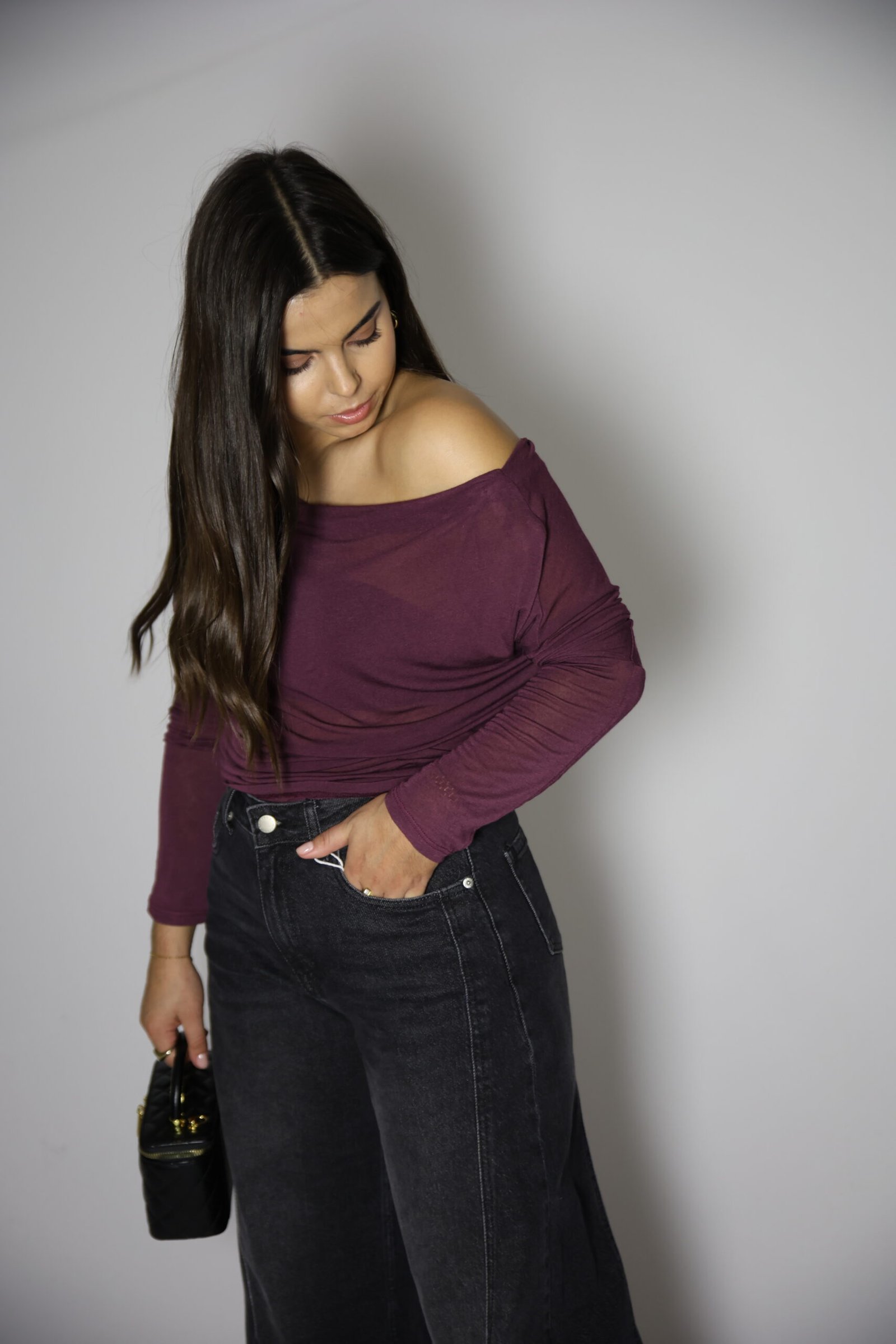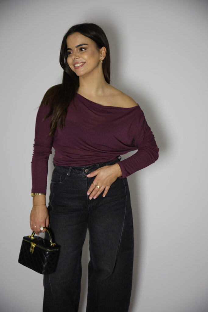 Camisola com 7% caxemira, tecido suave e com transparência. Decote assimétrico e manga comprida.