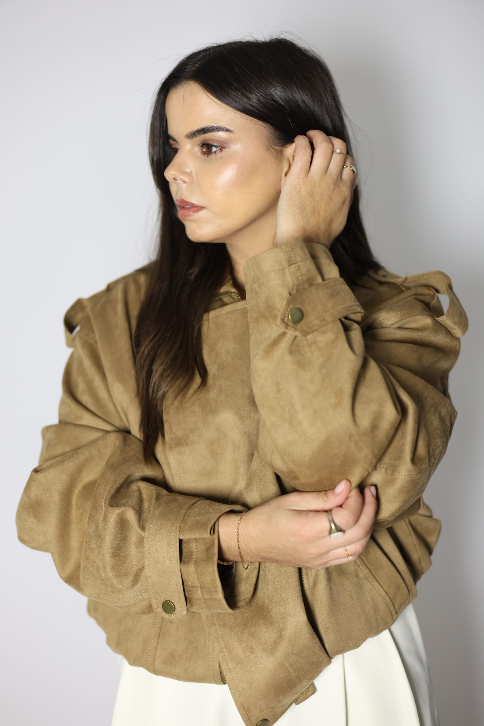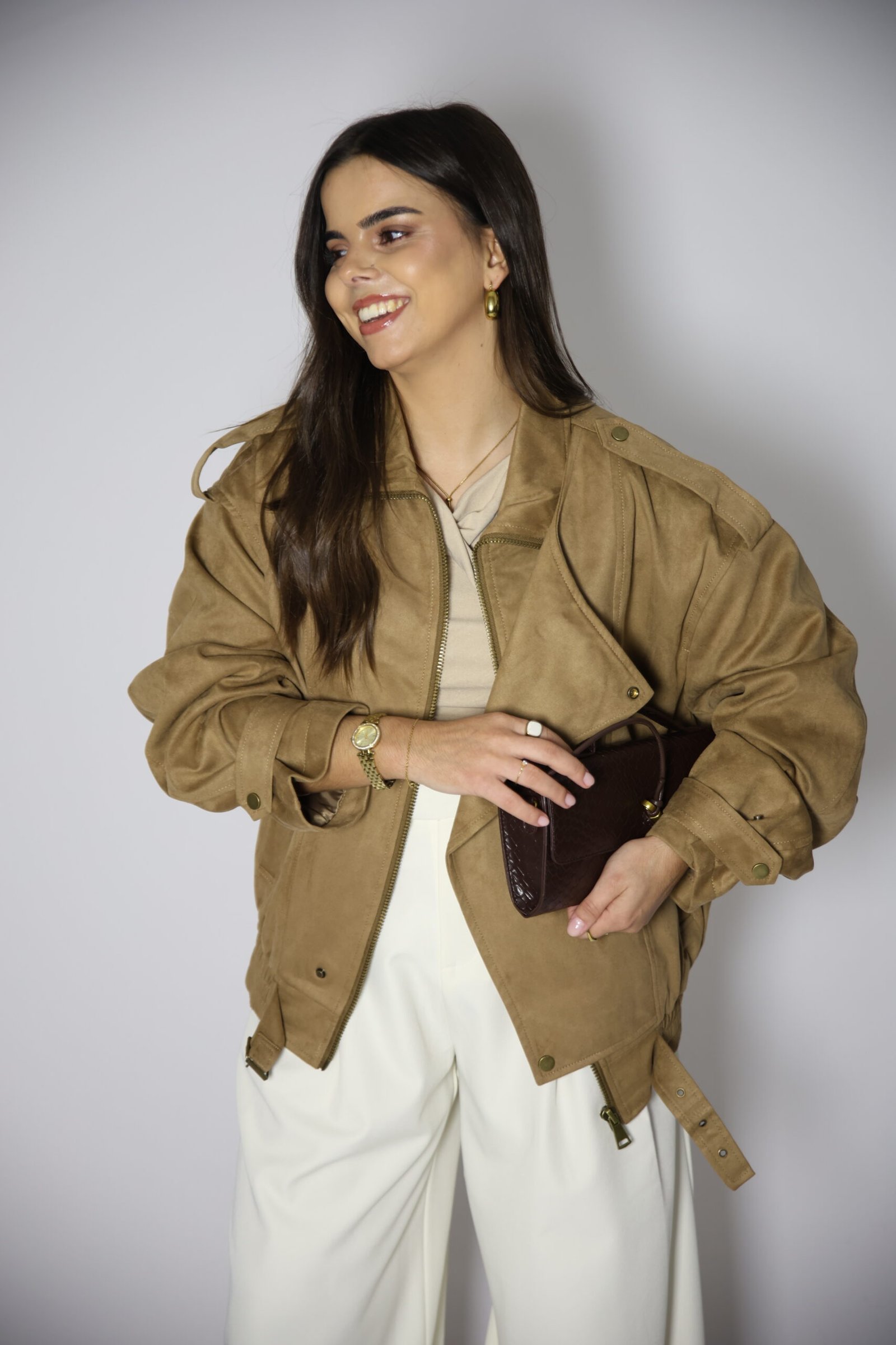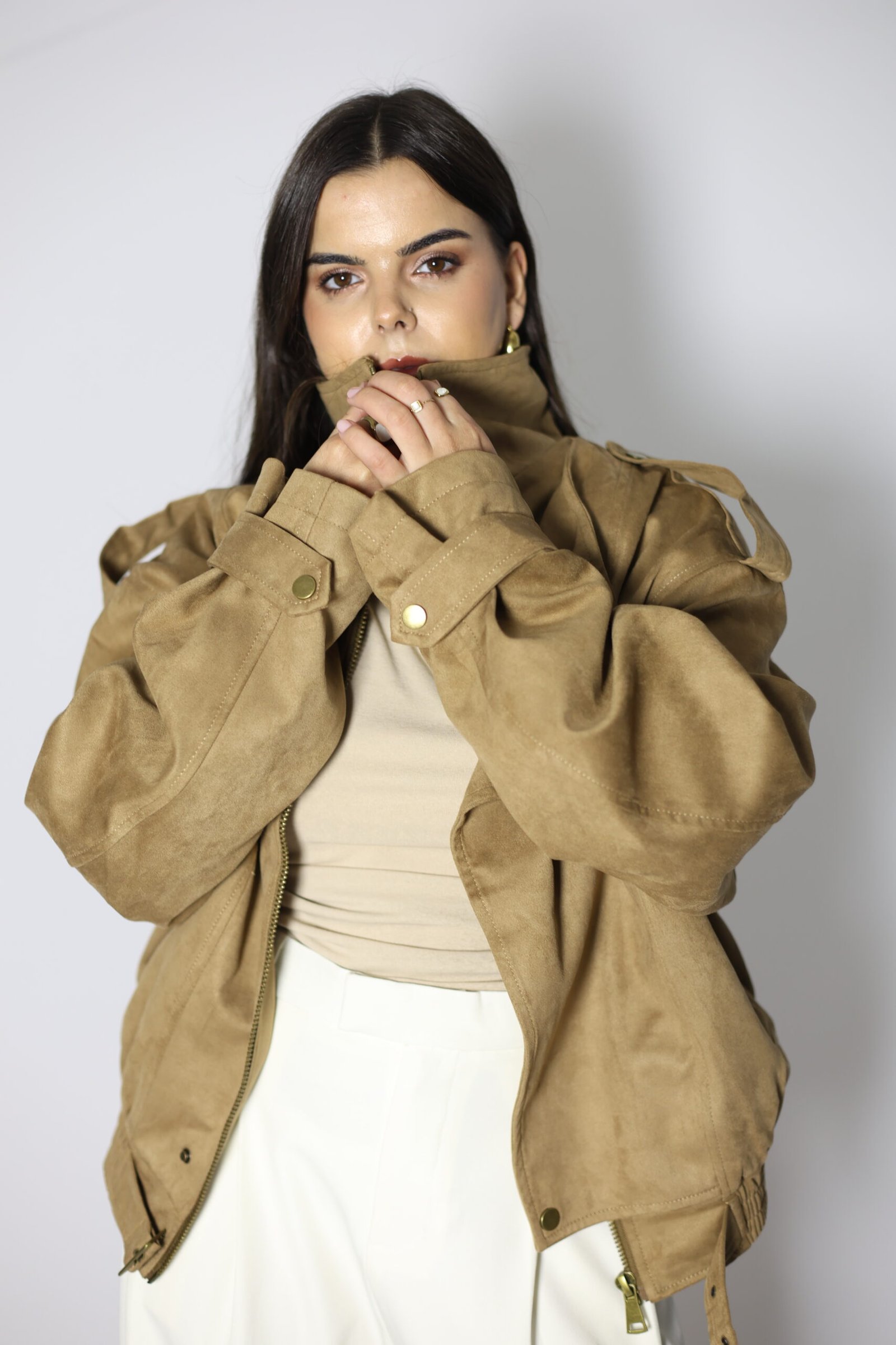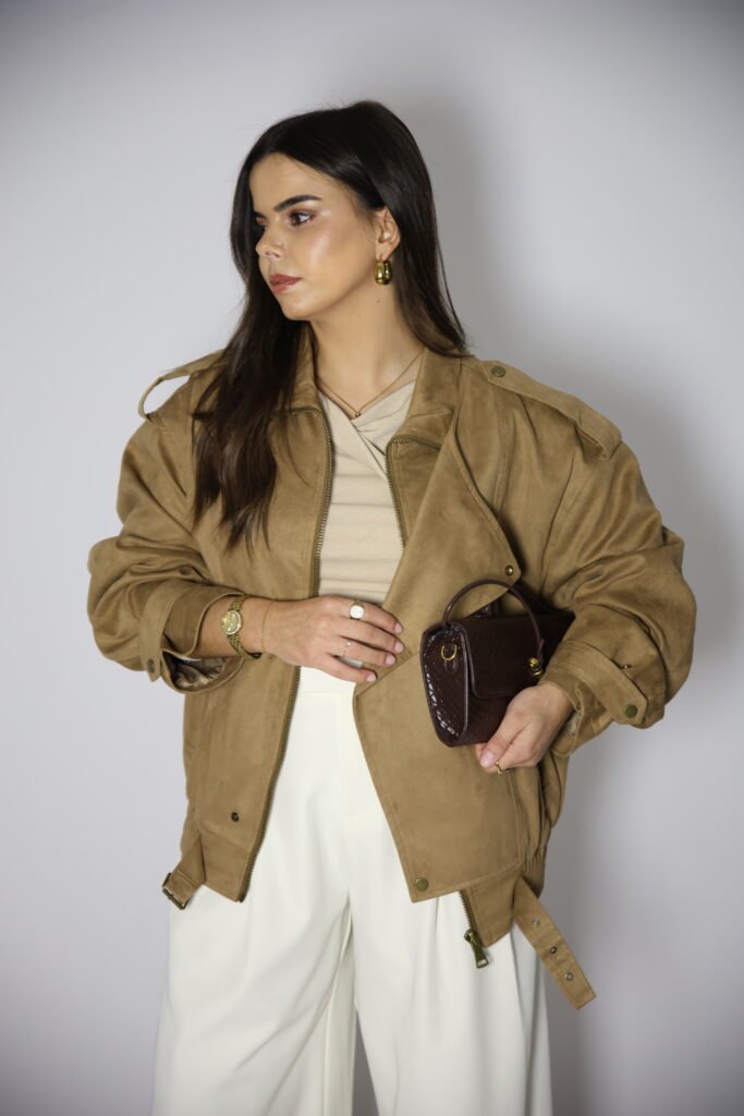 Casaco bomber de camurça com gola e lapela com manga comprida com presilha no ombro. Fecho frontal com fecho de correr oculto e botões de pressão. Cintura ajustável com cinto.