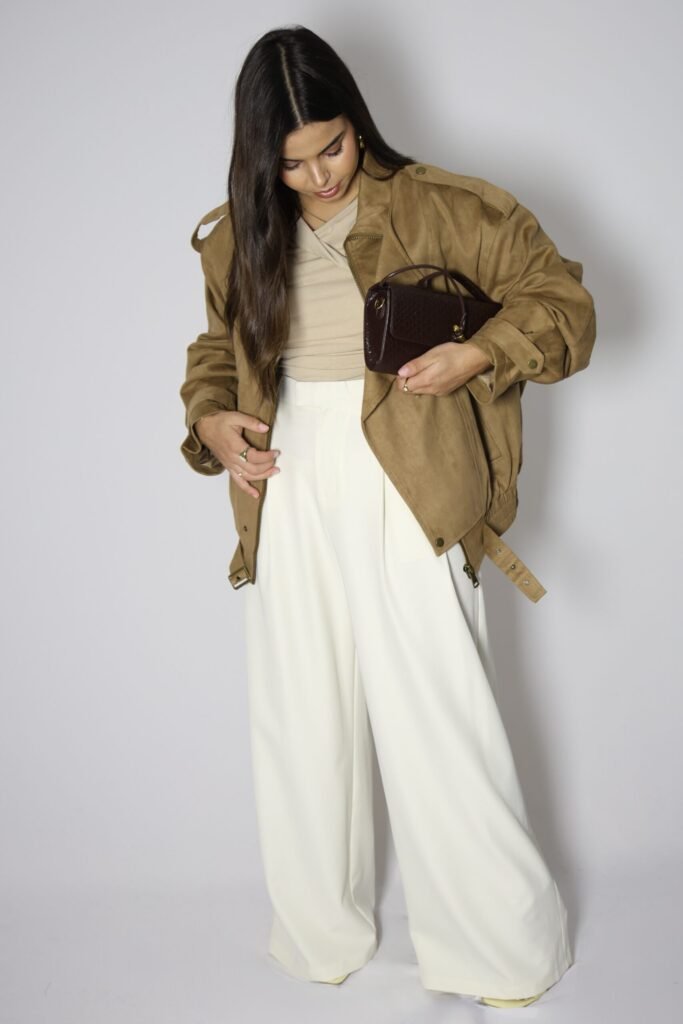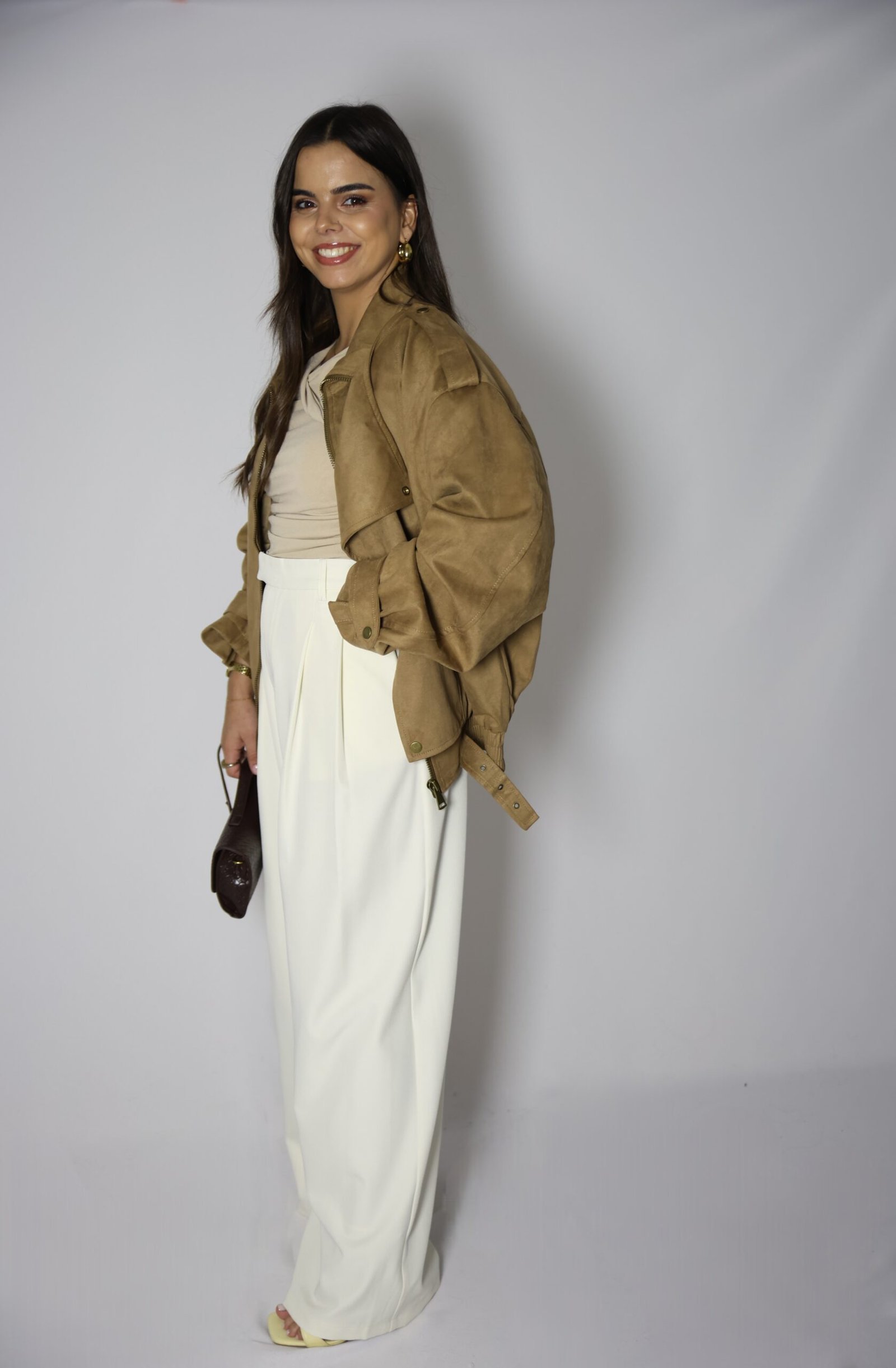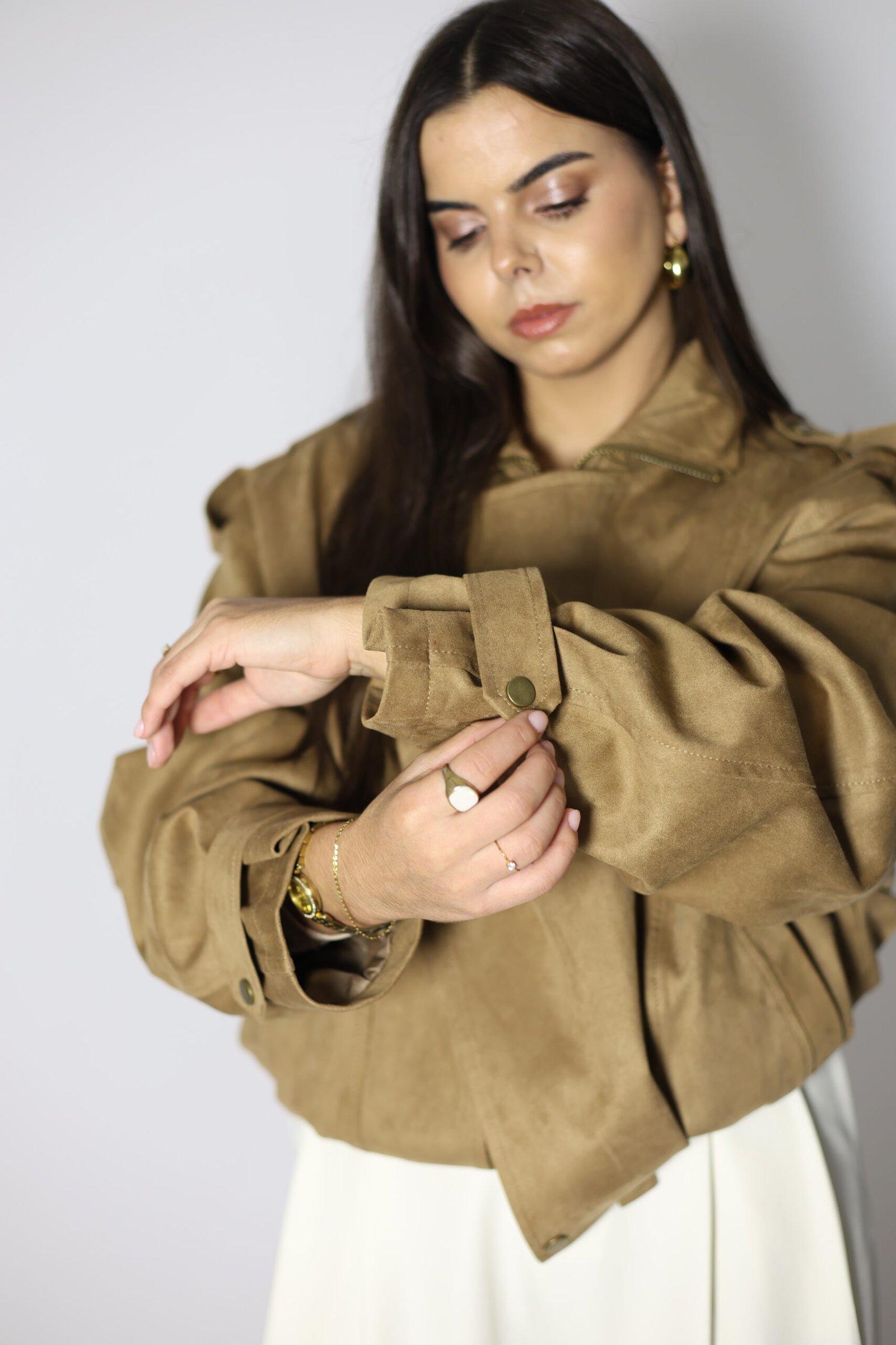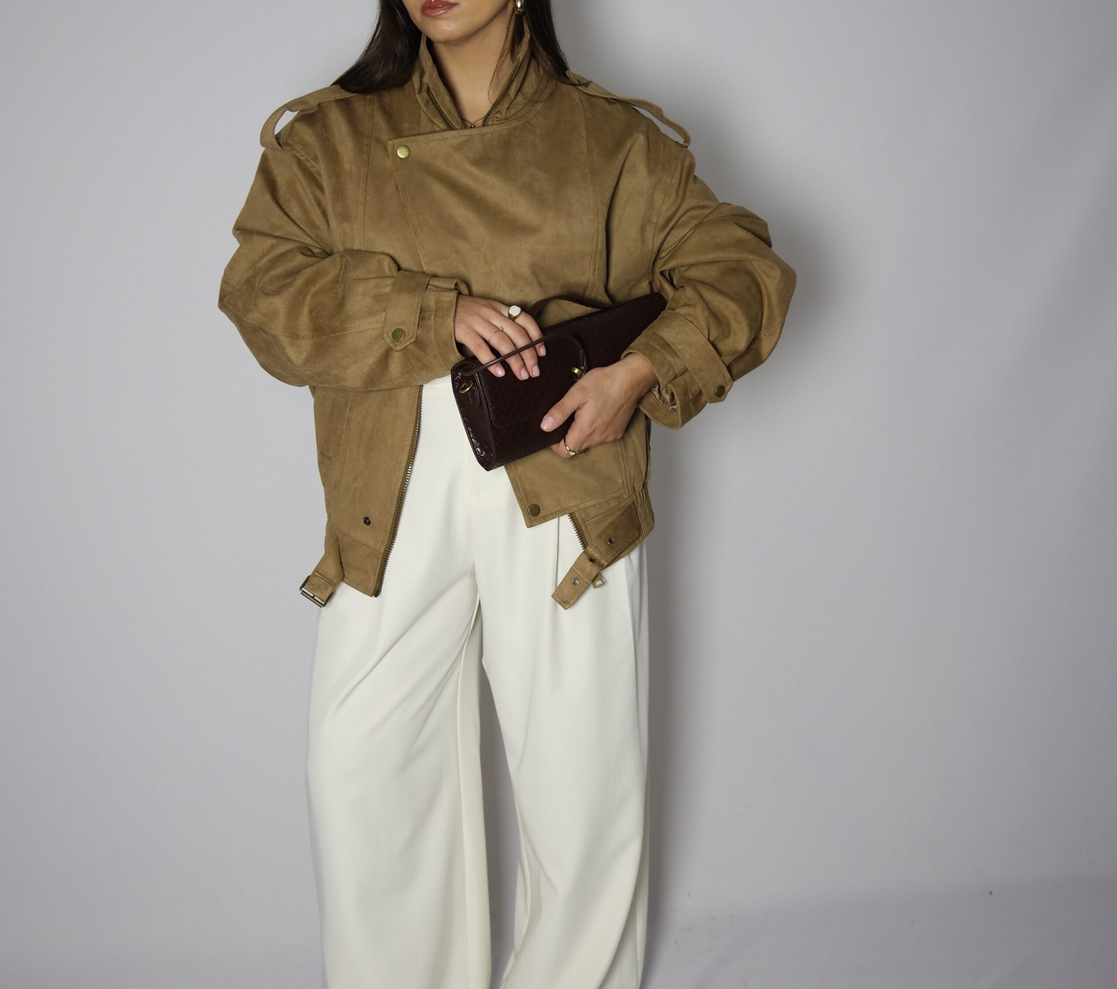 Casaco bomber de camurça com gola e lapela com manga comprida com presilha no ombro. Fecho frontal com fecho de correr oculto e botões de pressão. Cintura ajustável com cinto.