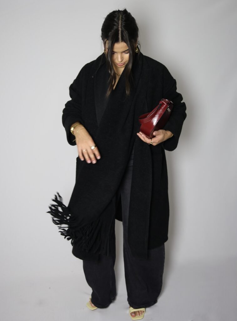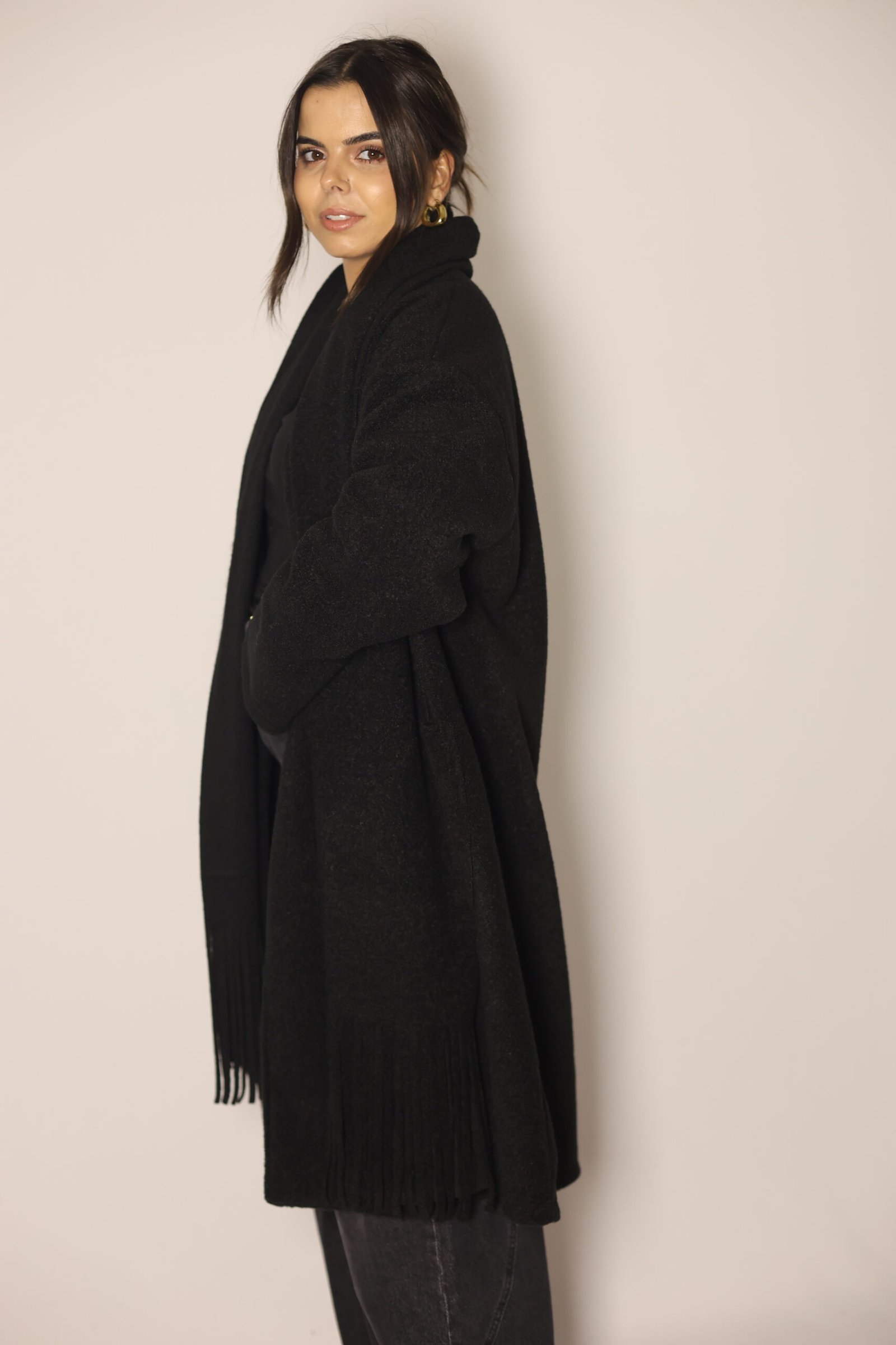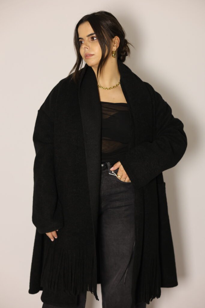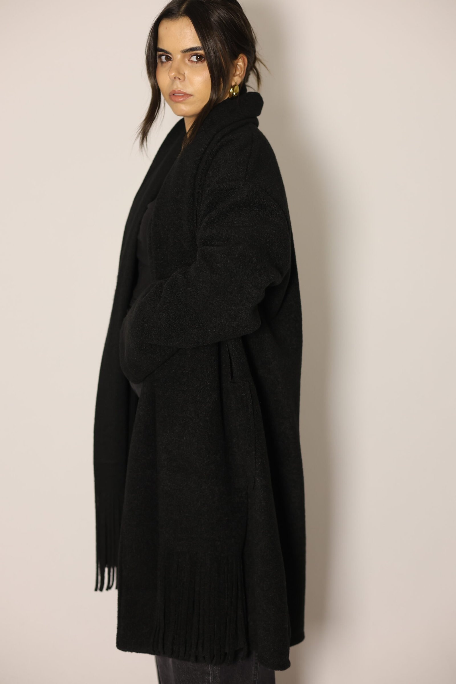 Casaco aberto de malha lisa com manga comprida. Bolsos laterais ocultos na costura. Gola com cachecol com acabamento em franjas no mesmo tecido, removível.