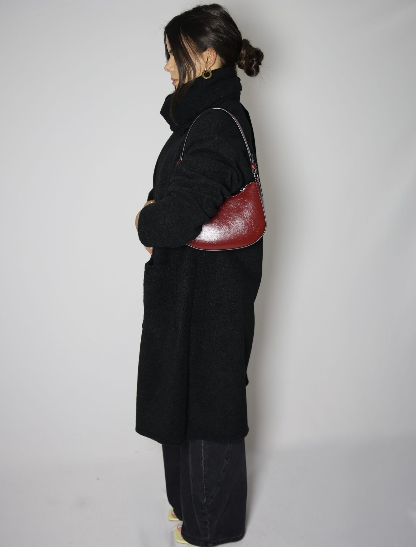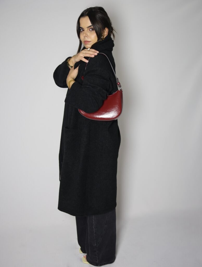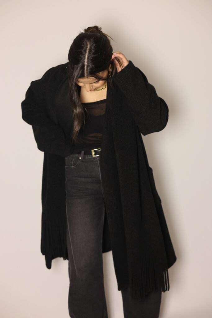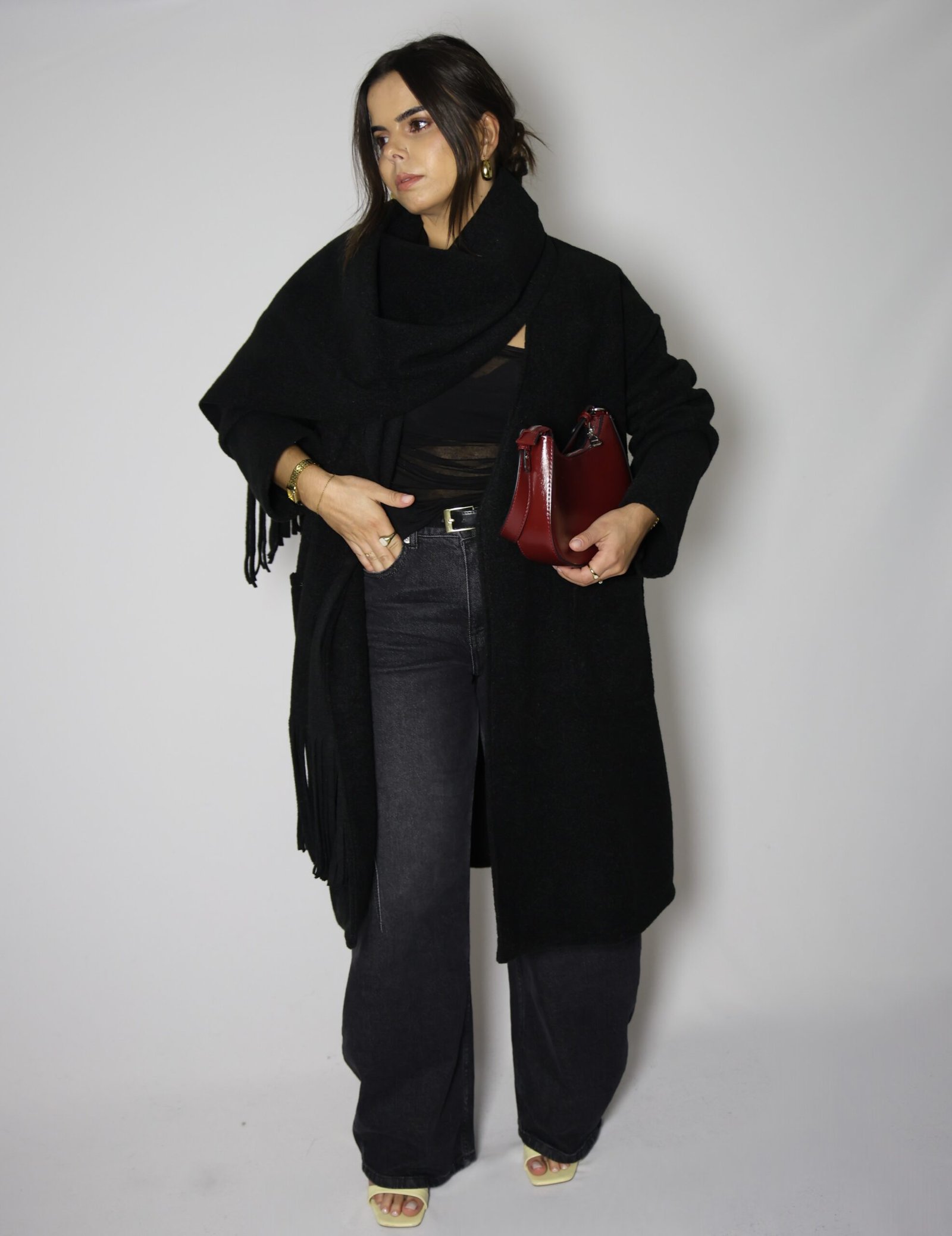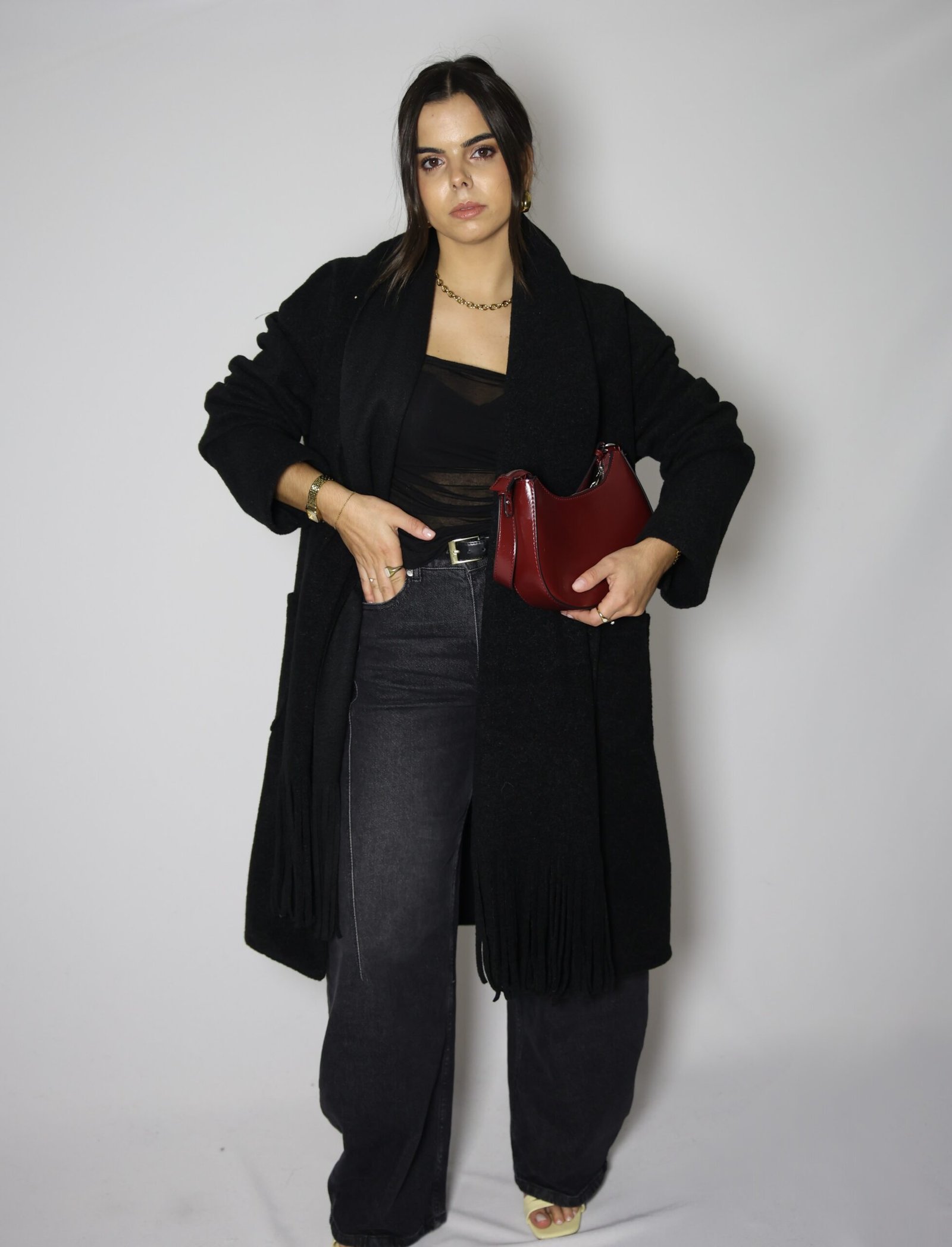 Casaco aberto de malha lisa com manga comprida. Bolsos laterais ocultos na costura. Gola com cachecol com acabamento em franjas no mesmo tecido, removível.