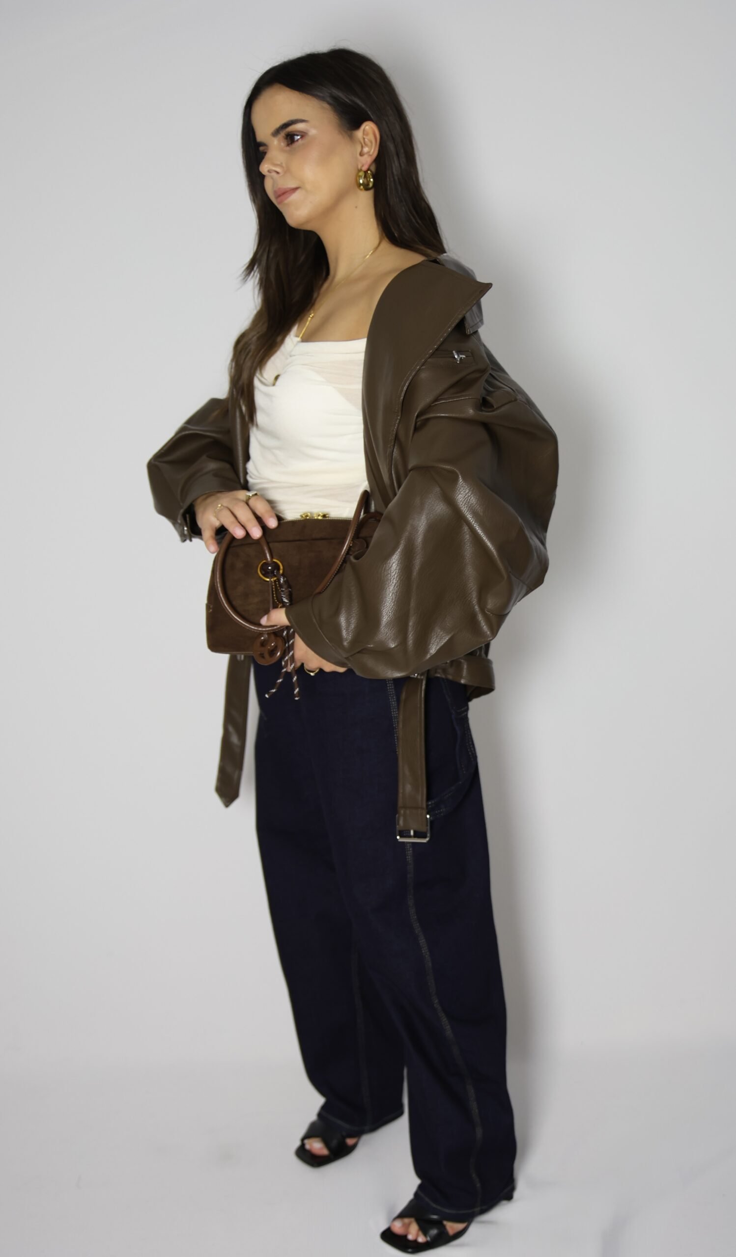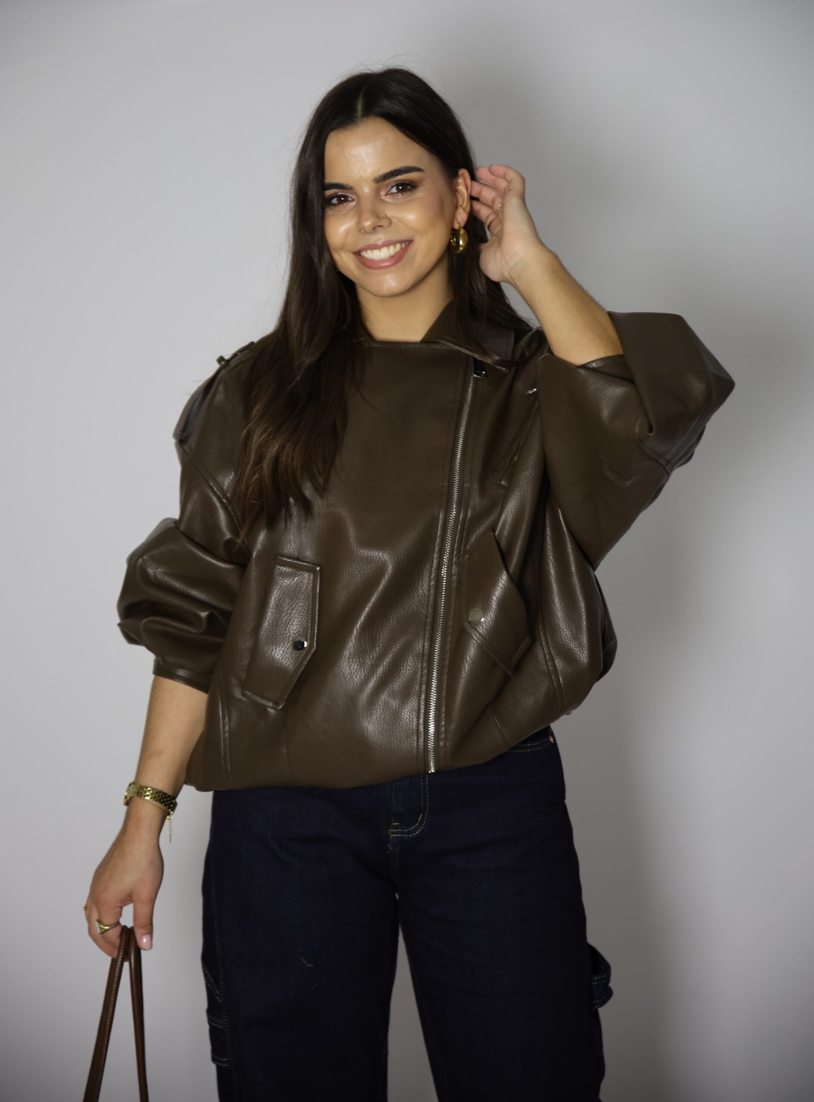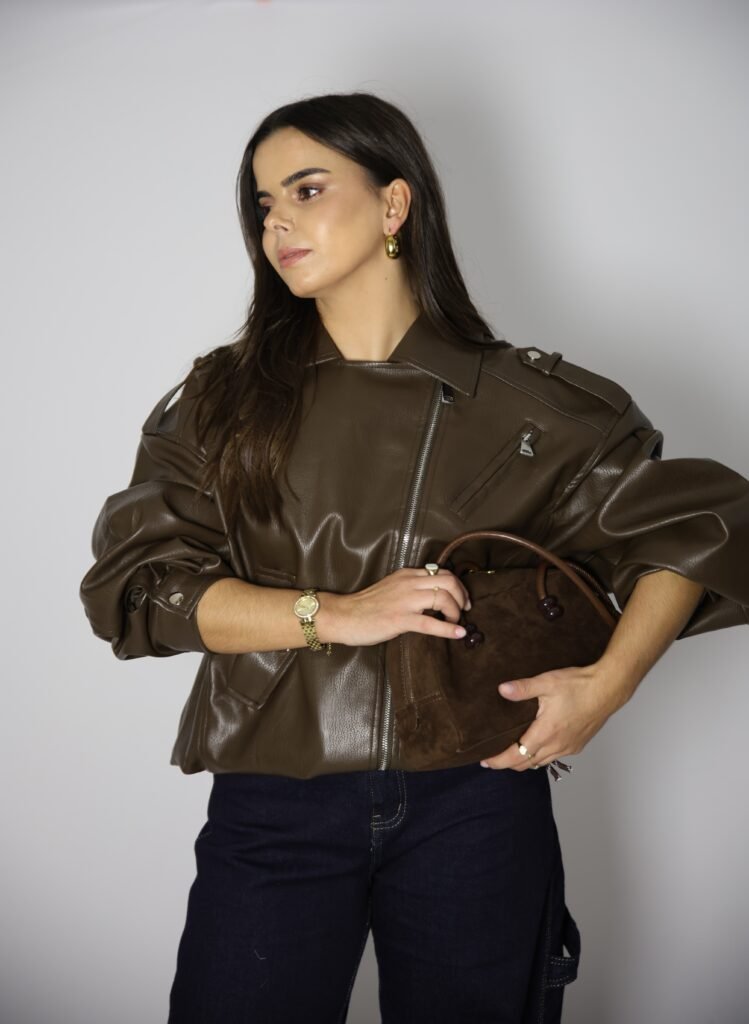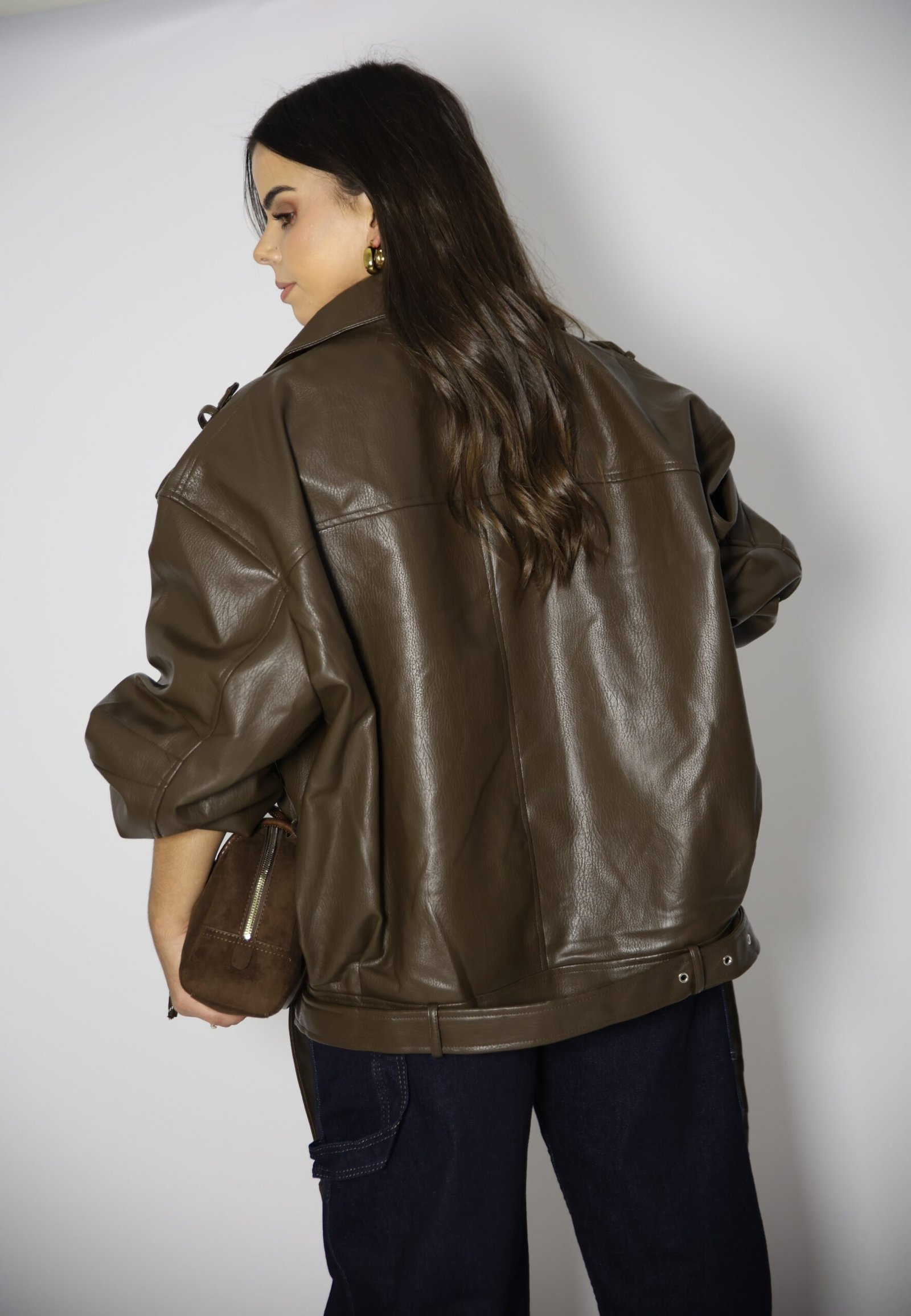 Blusão de gola de abas e manga comprida com presilhas no ombro. Bolsos à frente com lapela. Cinto no mesmo material com fivela metálica. Fecho frontal com fecho de correr.