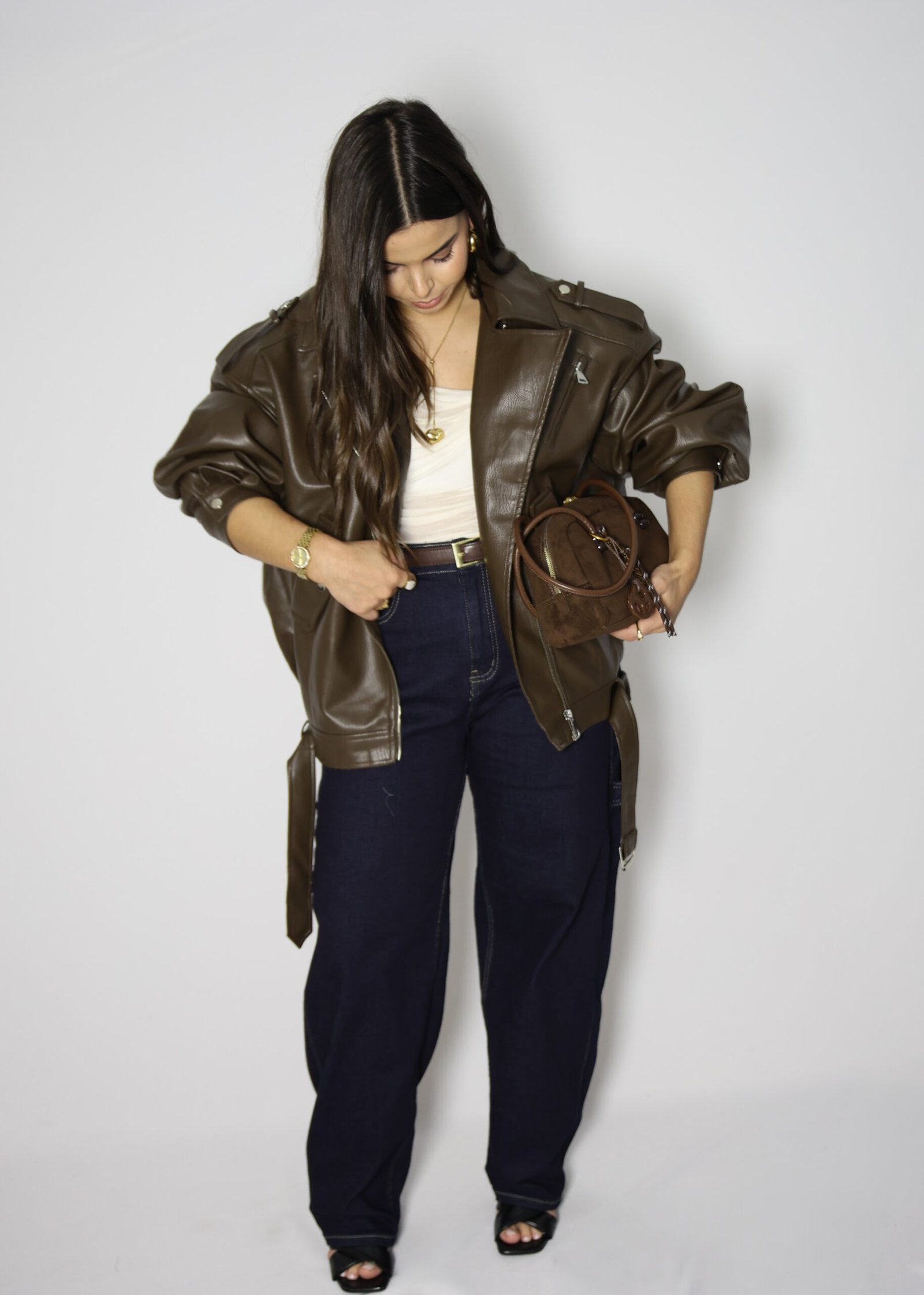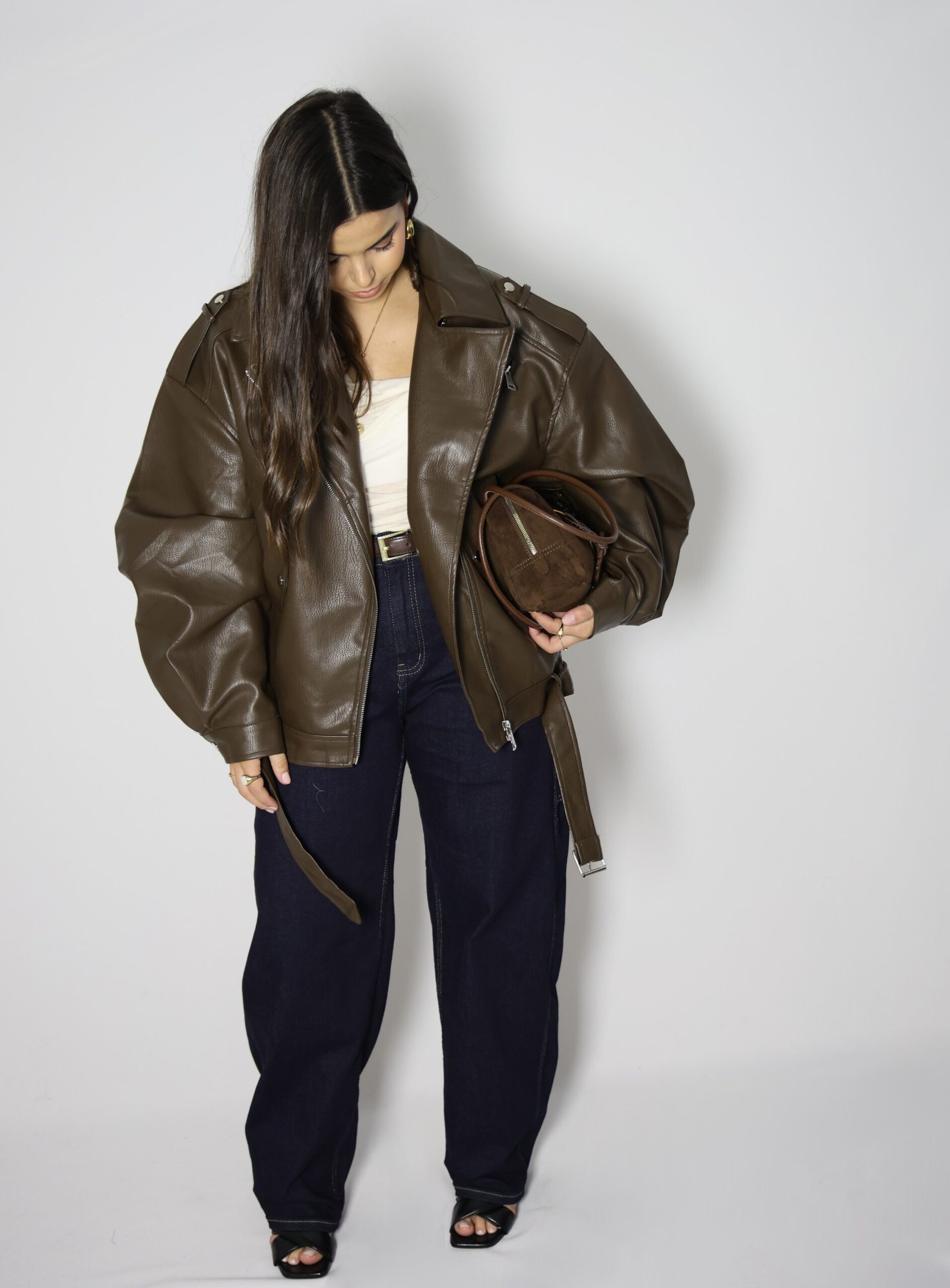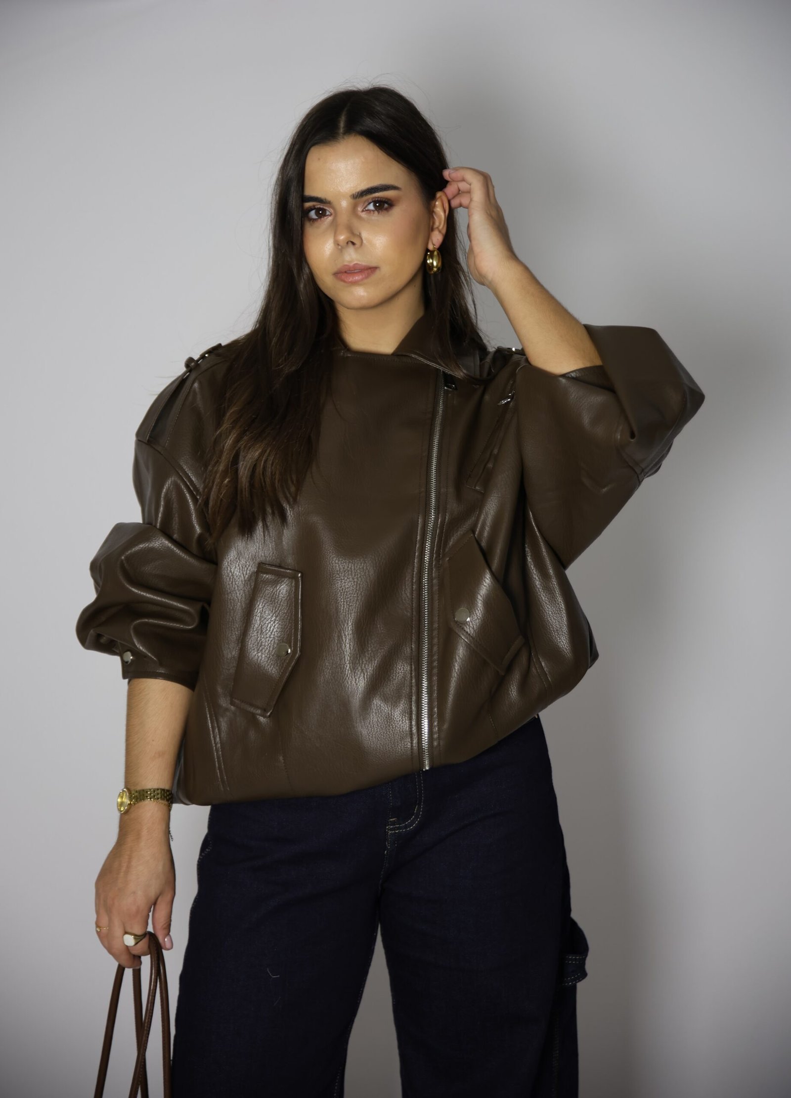 Blusão de gola de abas e manga comprida com presilhas no ombro. Bolsos à frente com lapela. Cinto no mesmo material com fivela metálica. Fecho frontal com fecho de correr.