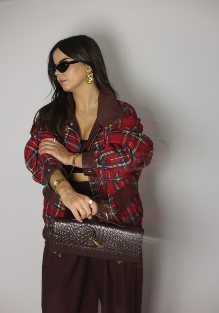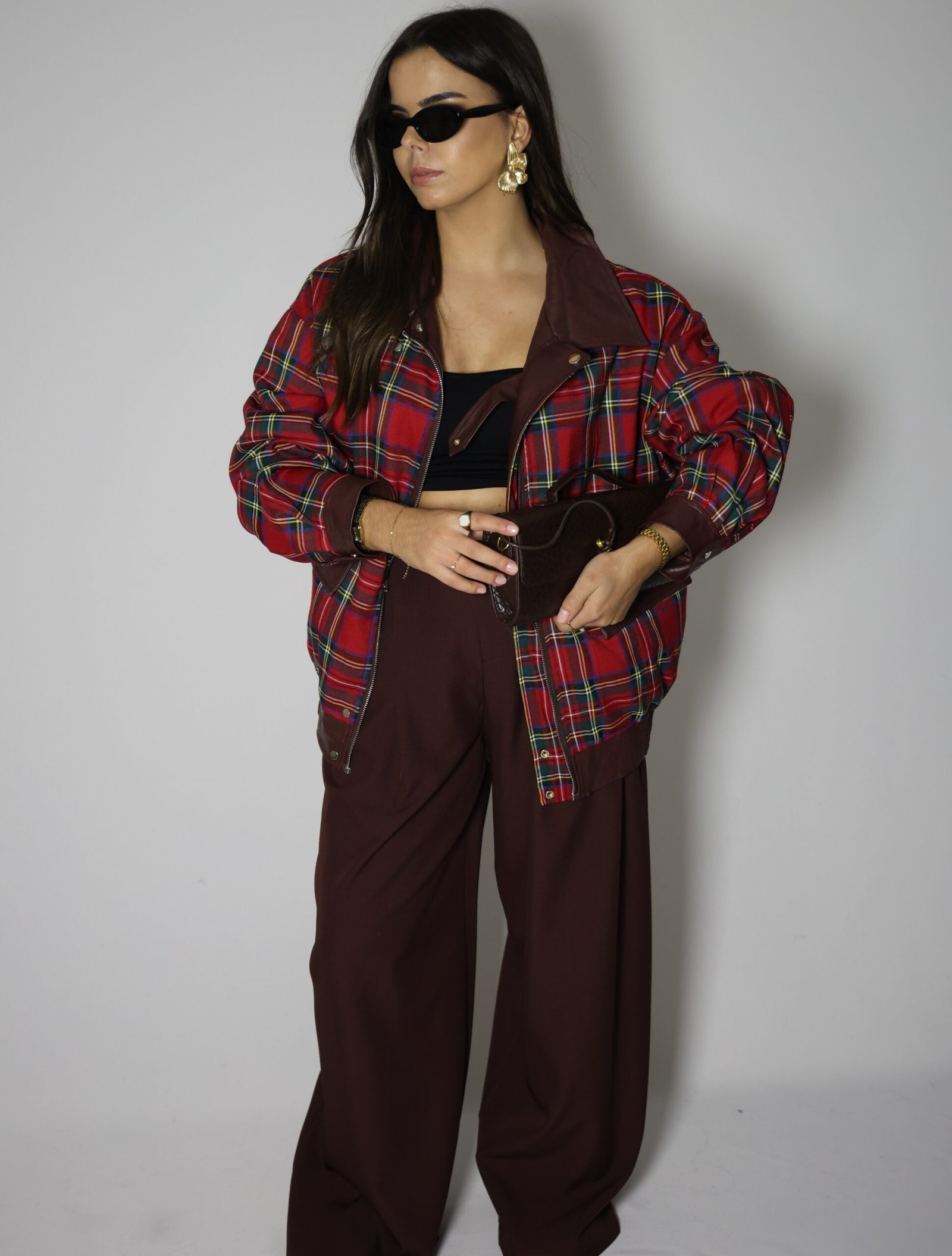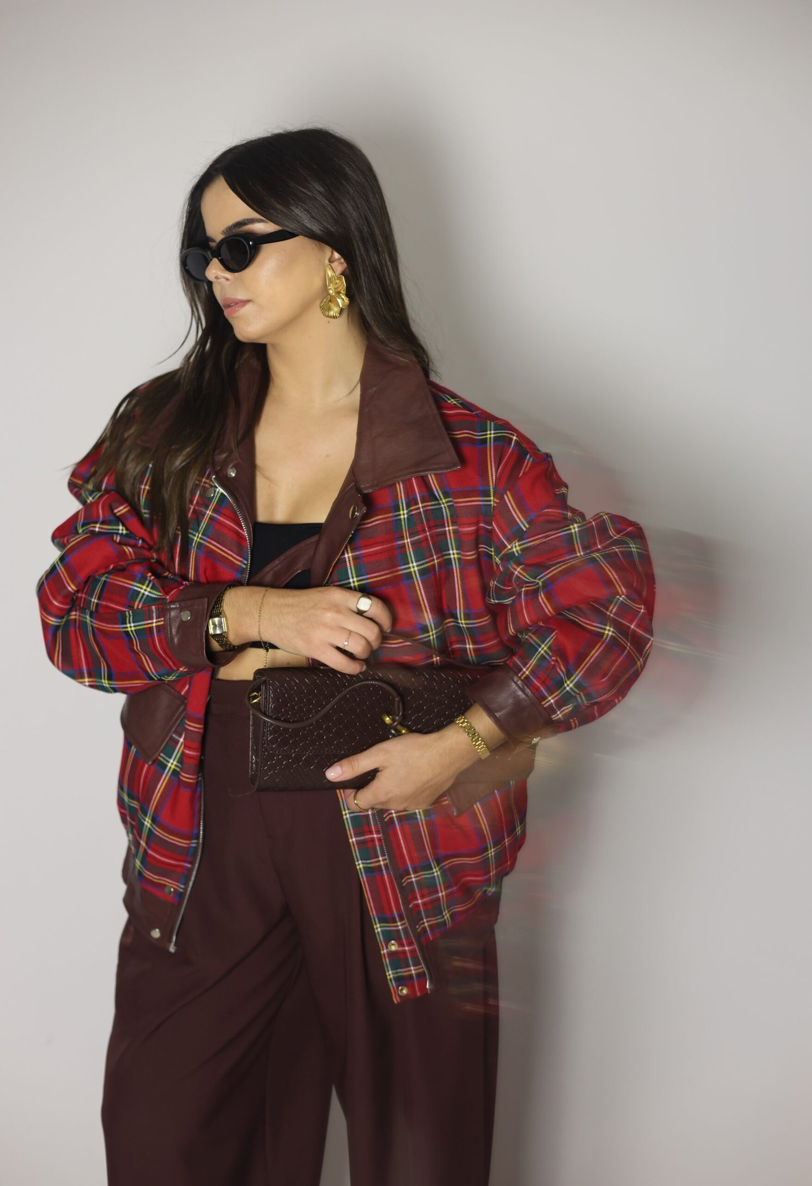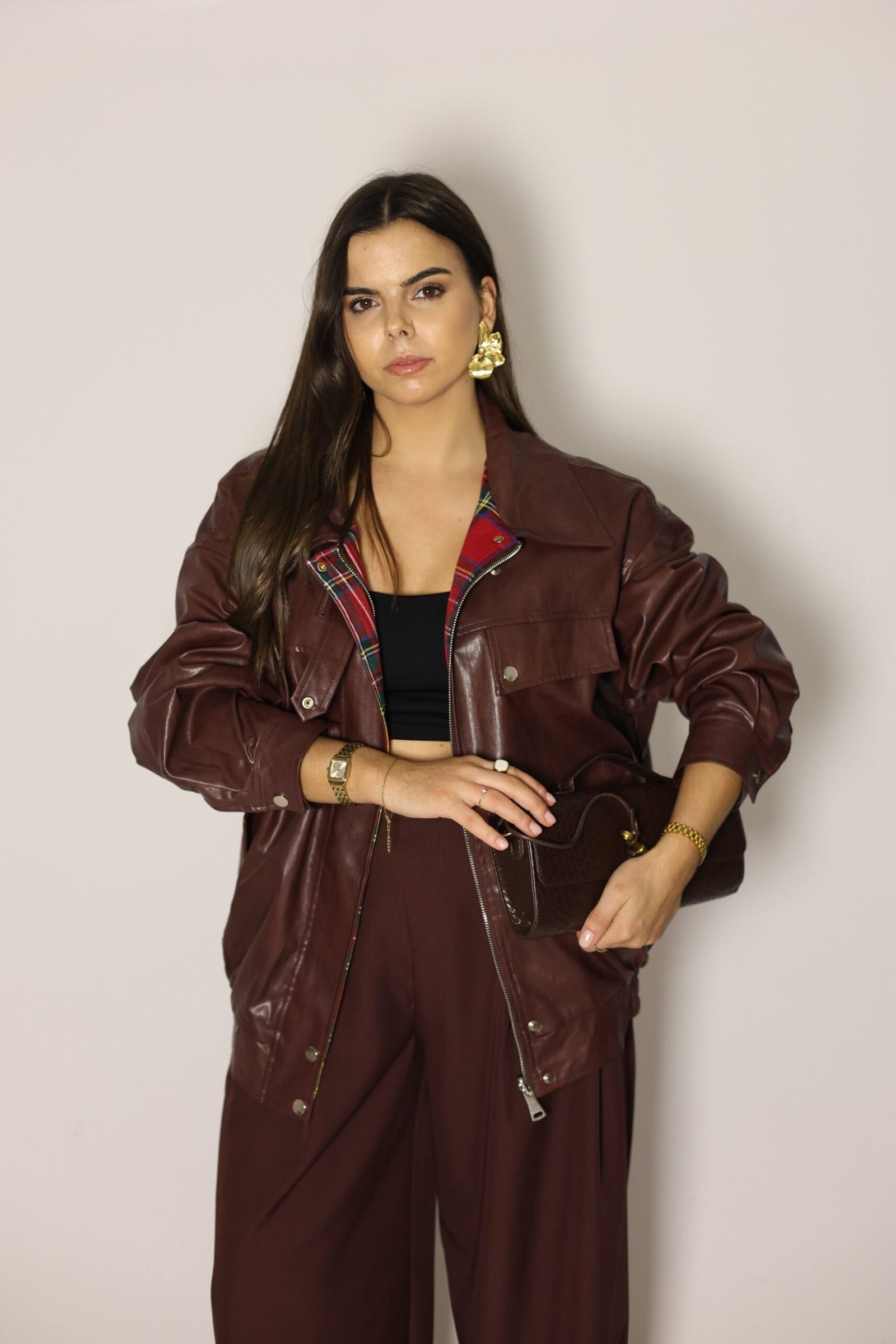 Blusão reversível com gola de lapela e manga comprida. Bolsos frontais. Tecido combinado com efeito de polipele e tecido xadrez. Fecho frontal com botões.