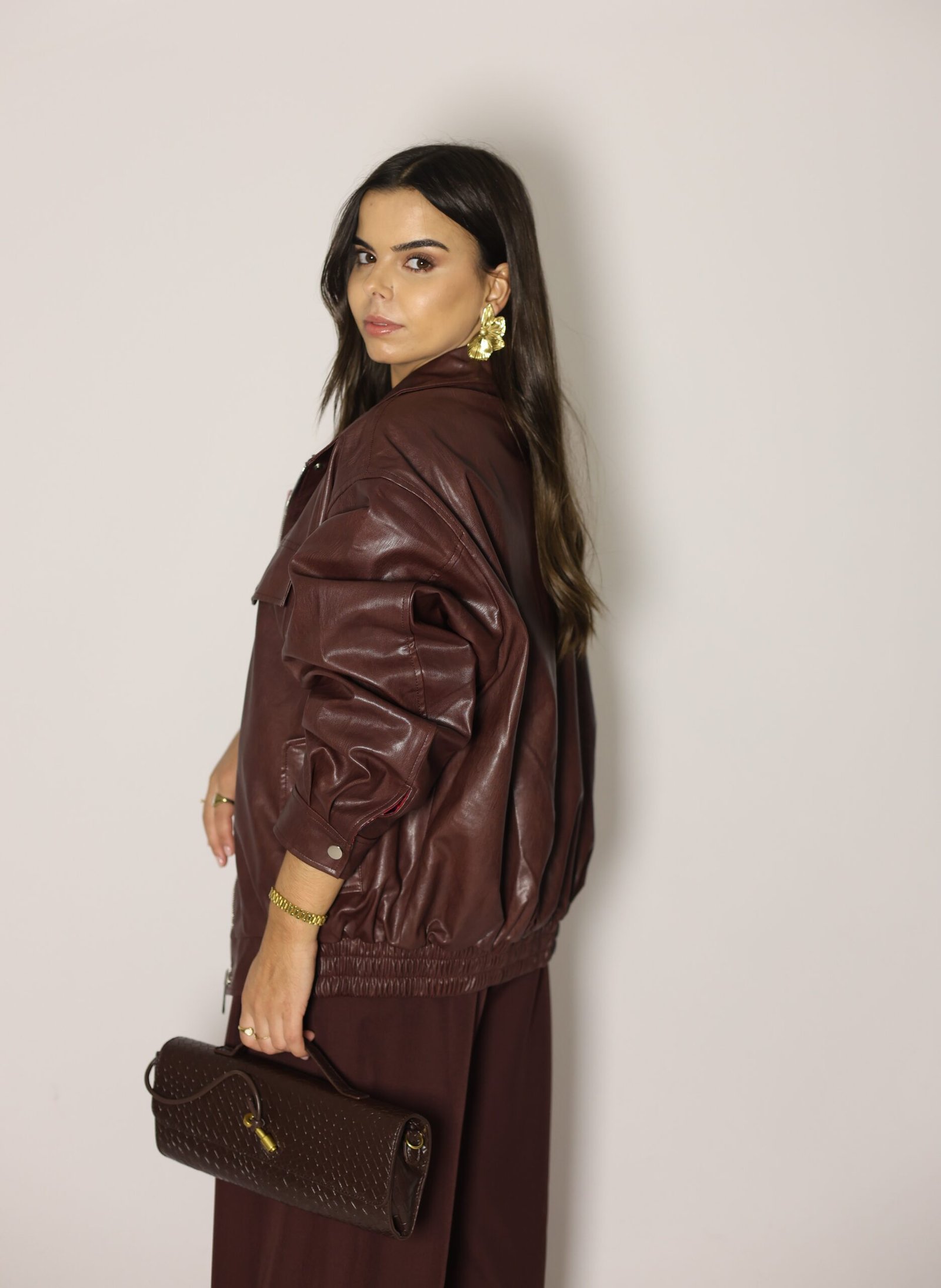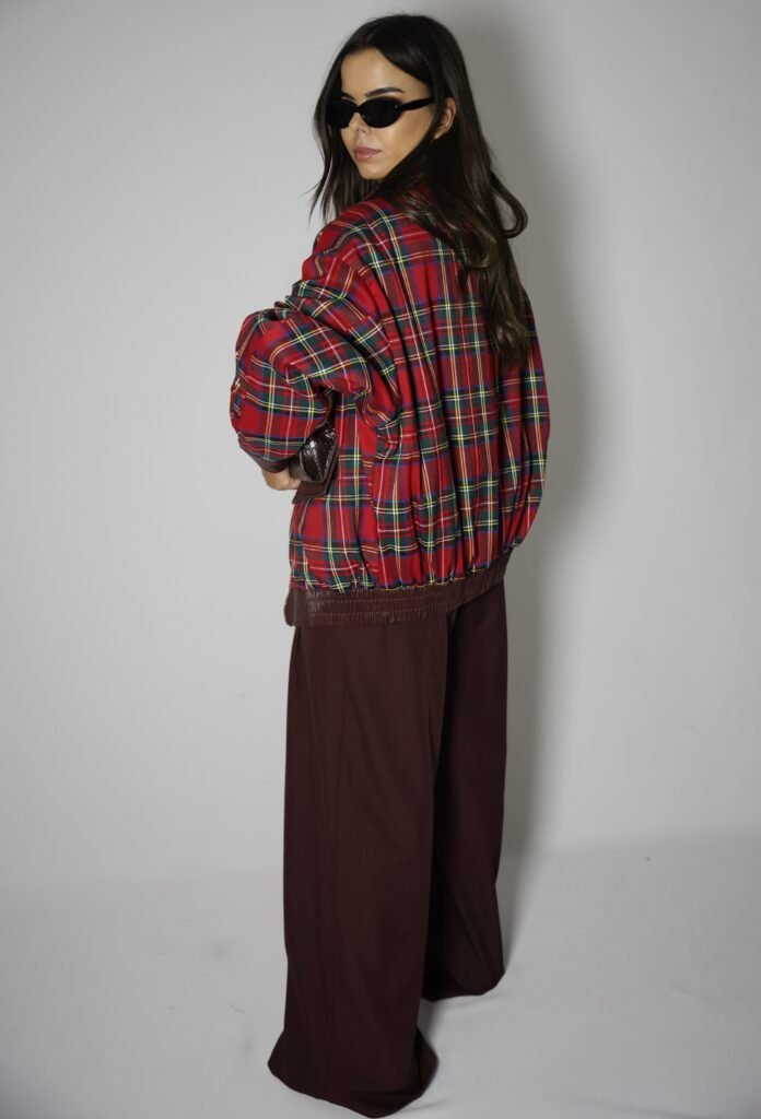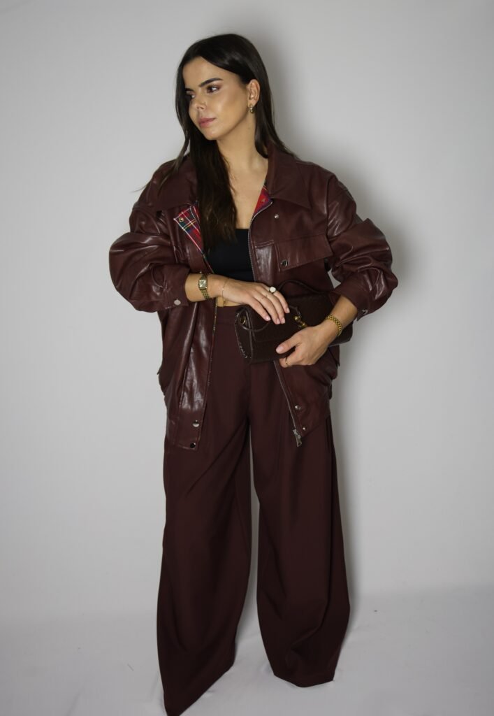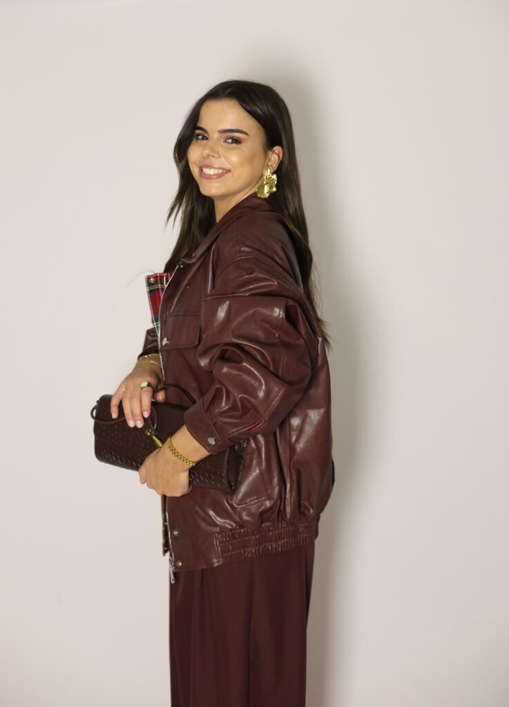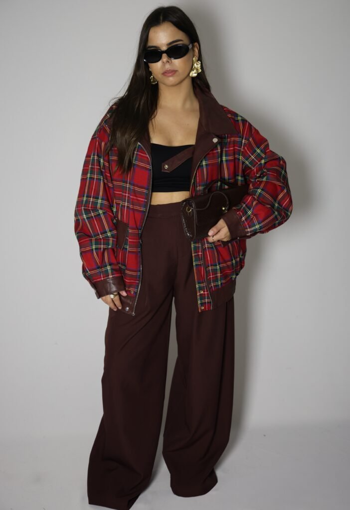 Blusão reversível com gola de lapela e manga comprida. Bolsos frontais. Tecido combinado com efeito de polipele e tecido xadrez. Fecho frontal com botões.